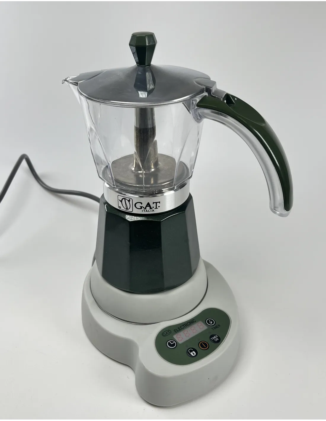 Elektrická moka kanvica G.A.T. Vintage na prípravu 4-6 šálok silnej čerstvej kávy, nech ste kdekoľvek. Farba: zelená. POUŽITÝ - ZĽAVA.