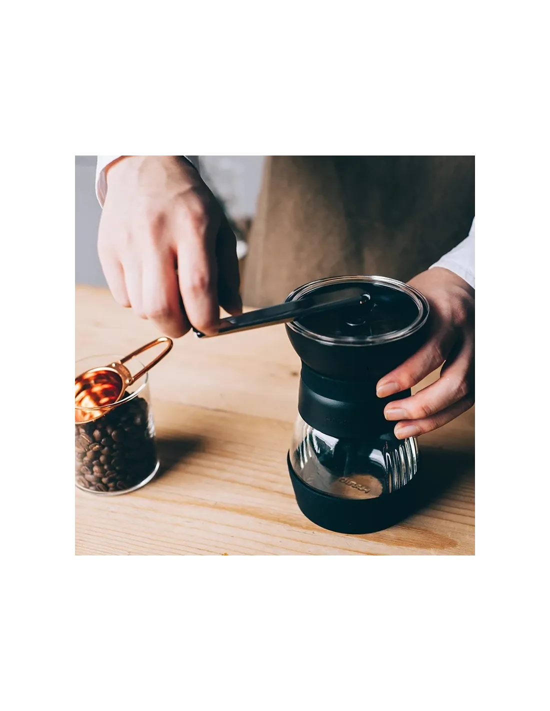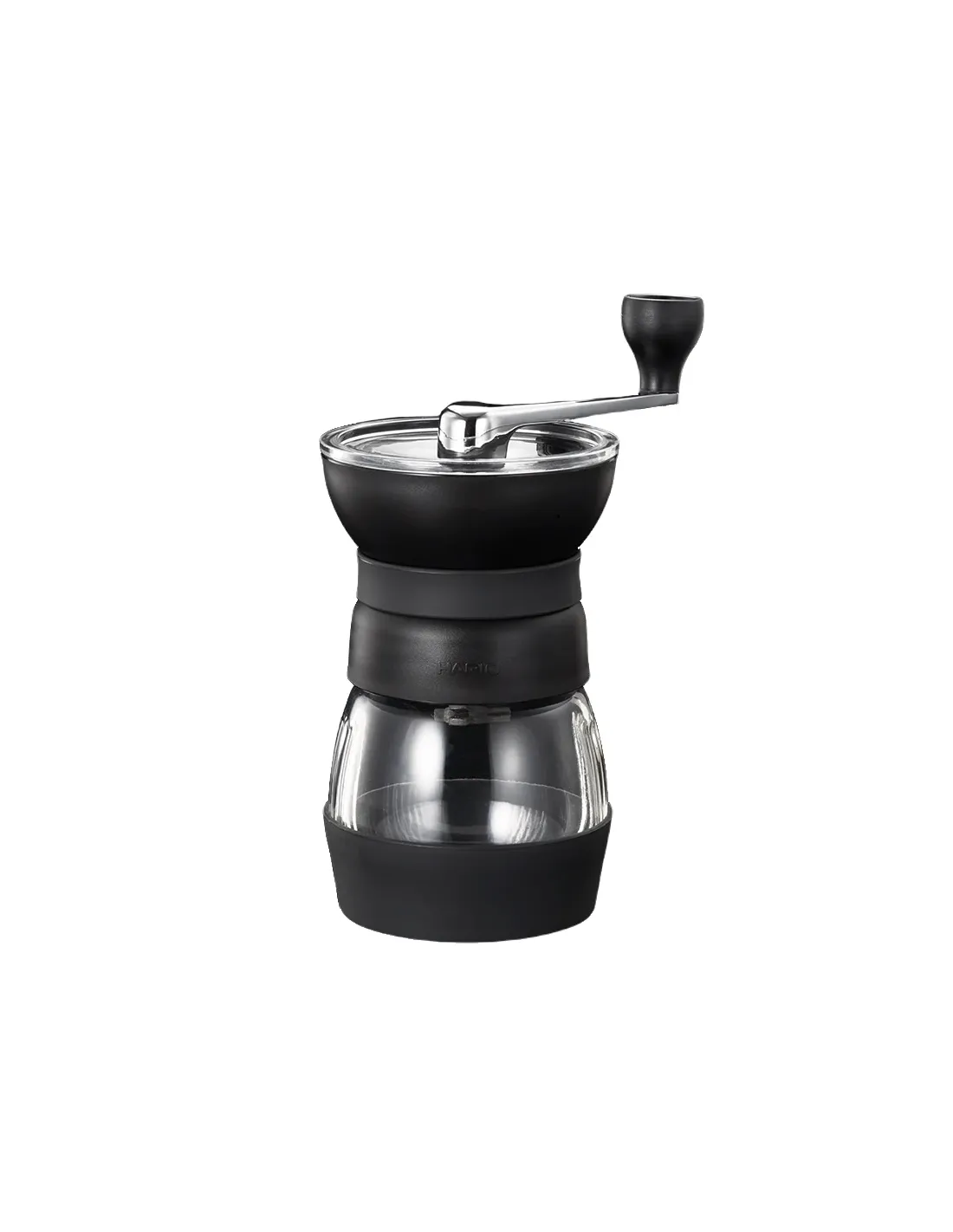 Vďaka ergonomickému tvaru sa mlynček veľmi dobre drží v ruke a mletie je veľmi pohodlné. Spodná časť mlynčeka je vybavená protišmykovou podložkou z odolnej gumy, ktorá zabezpečí, že mlynček nebude pri mletí skákať ani na klzkom povrchu. Priehľadná sklenená nádoba na mletú kávu je vybavená vekom, takže ju môžete použiť na uskladnenie kávy na neskoršie použitie. Zmestí sa do nej až 100 g kávy. Pri mlynčeku Skerton PRO vás poteší aj silikónová obruč v mieste uchopenia mlynčeka, vďaka ktorej je mletie pohodlnejšie.
