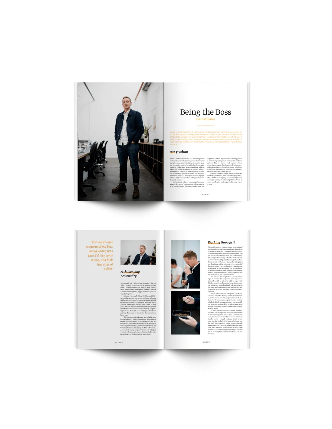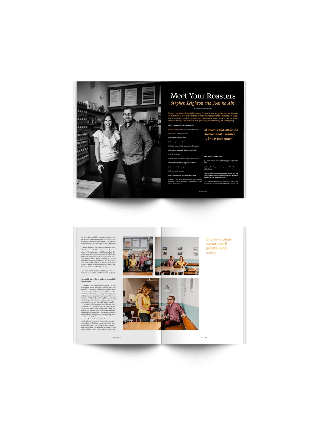 Kapitola "Ľudia" je plná príbehov o ľuďoch, ktorí tvoria kávový priemysel - od rozhovorov so svetoznámymi pražiarmi Stephenom Leightonom a Joannou Alm, cez opisy života v New Yorku až po nádherne vykreslené spomienky Tima Williamsa na životné lekcie.