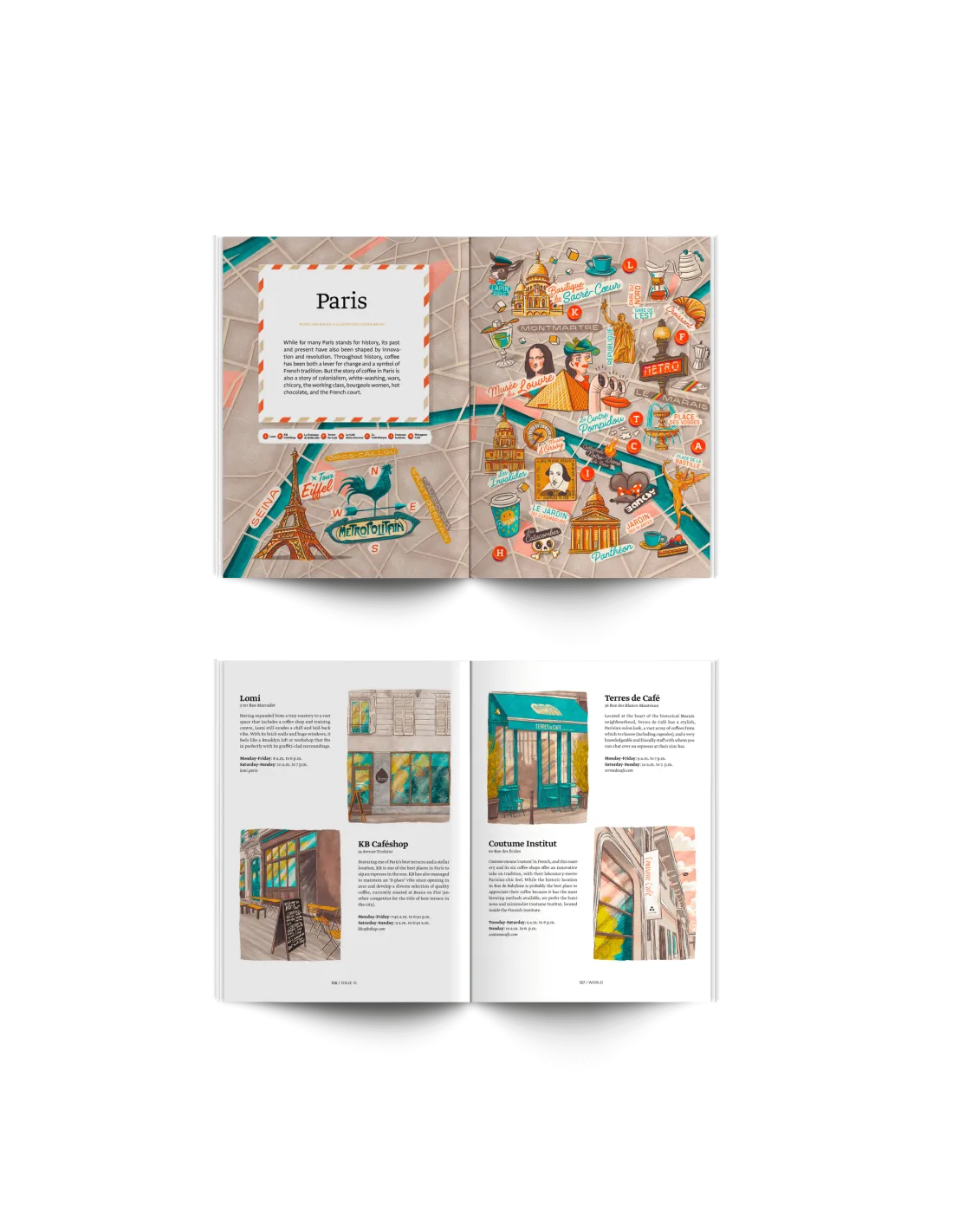 V kapitole "Svet" prinášame rozhovor s historikom kníh Gerim Della Roccom de Candiom o jeho nedávnej výstave o tlačiarenskej revolúcii v 15. storočí. Potom sa pozrieme na zvláštny vzťah medzi kávou a stand-up komédiou a naučíme sa niekoľko vtipov. Potom sa presunieme do Paríža, kde sa prejdeme politickými a kultúrnymi dejinami francúzskej metropoly - a to všetko očami kávy, a všetko zakončíme príbehom o samote, tvorbe a káve.