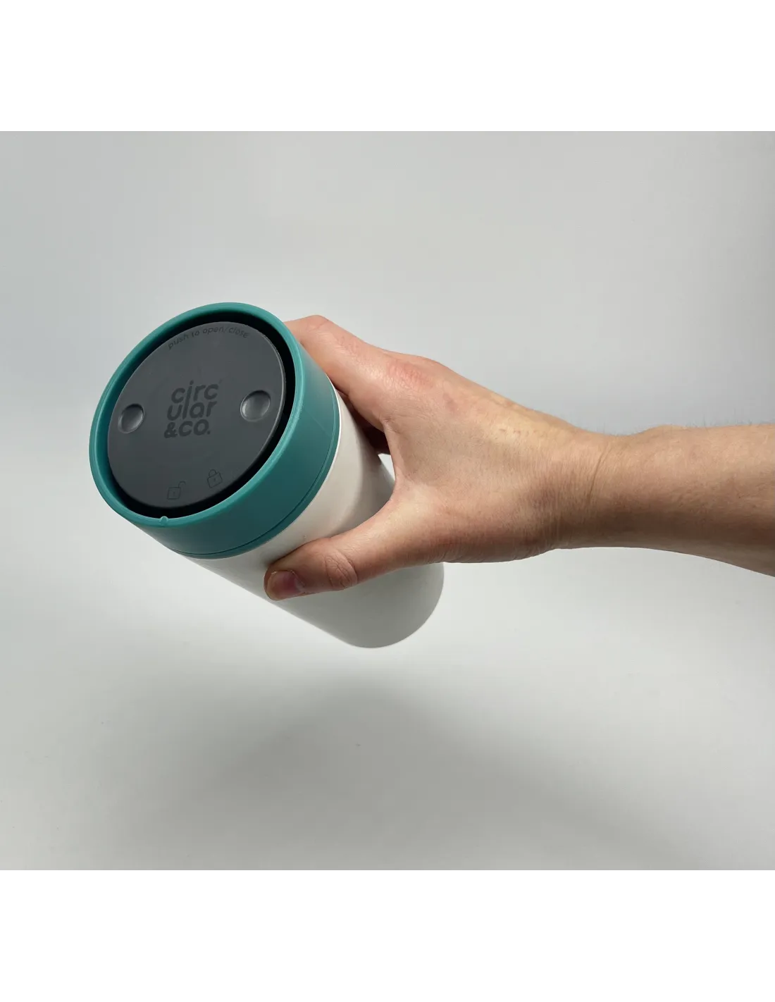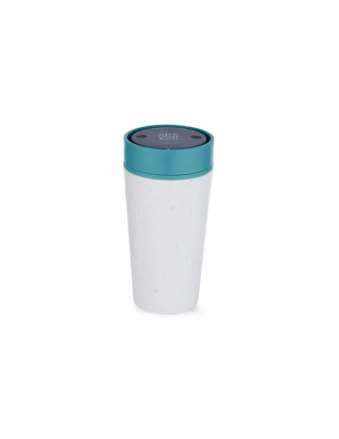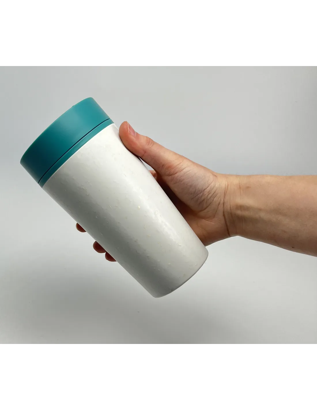 Štýlový pohár rcup vyrobený z recyklovaných materiálov, praktický a pohodlný na používanie. Elegantná farebná kombinácia kriedy a akvamarínu pre udržateľný a moderný dizajn.