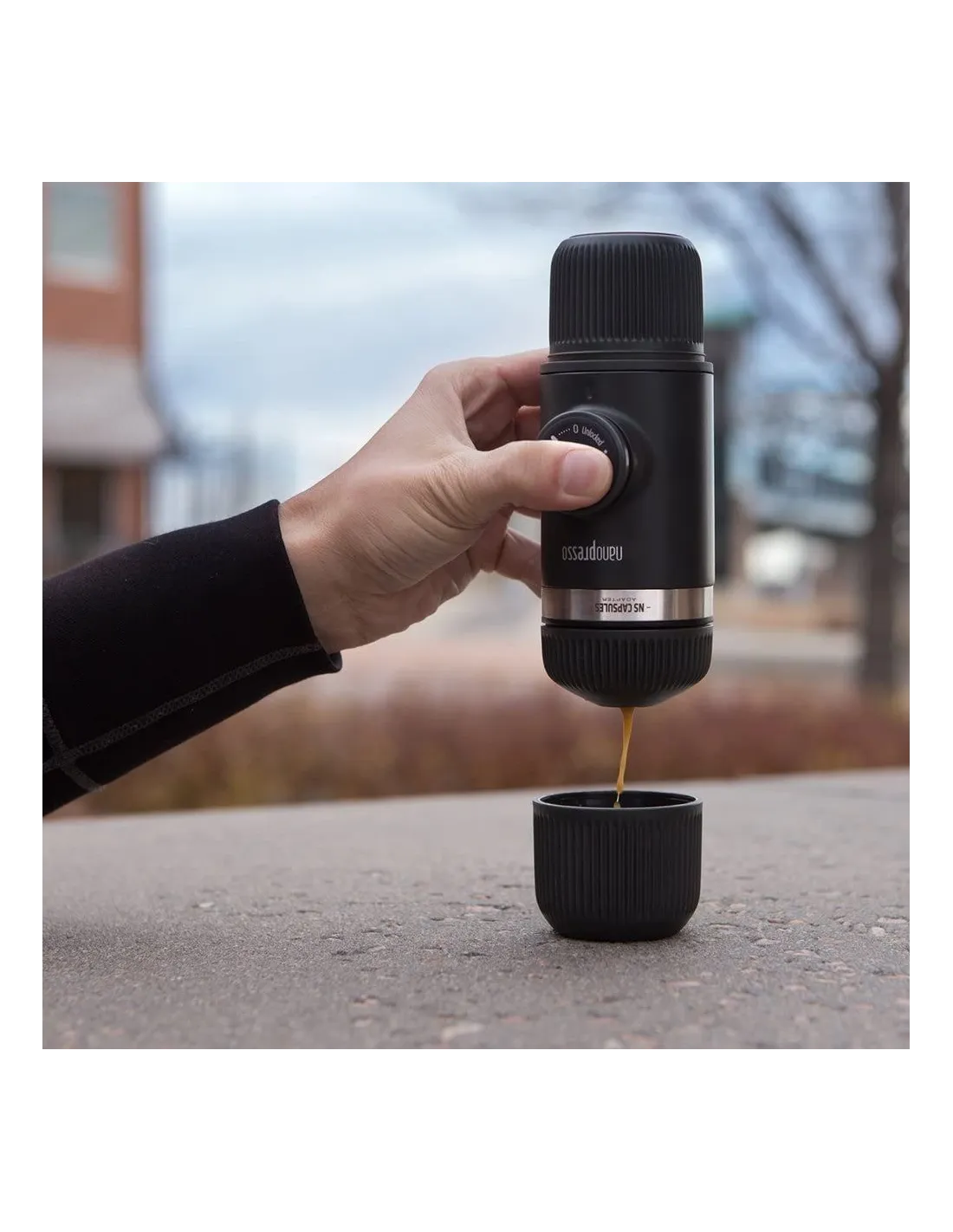 Nanopresso je vonkajší kávovar, ktorý pripravuje lahodné espresso na cestách bez elektrickej energie. Všetko, čo potrebujete, je horúca voda, káva a trochu energie.