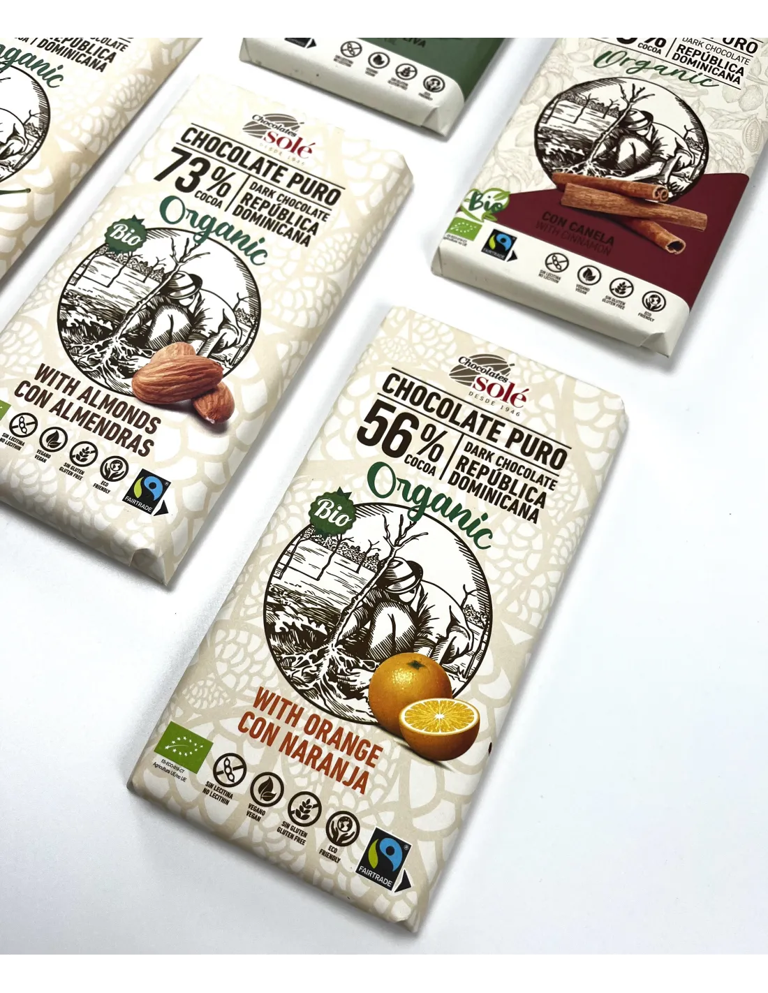 Chocolates Solé - 56% bio čokoláda s pomarančom. Ochutnajte najlepšie karibské kakao s nádychom stredomorského pomaranča.