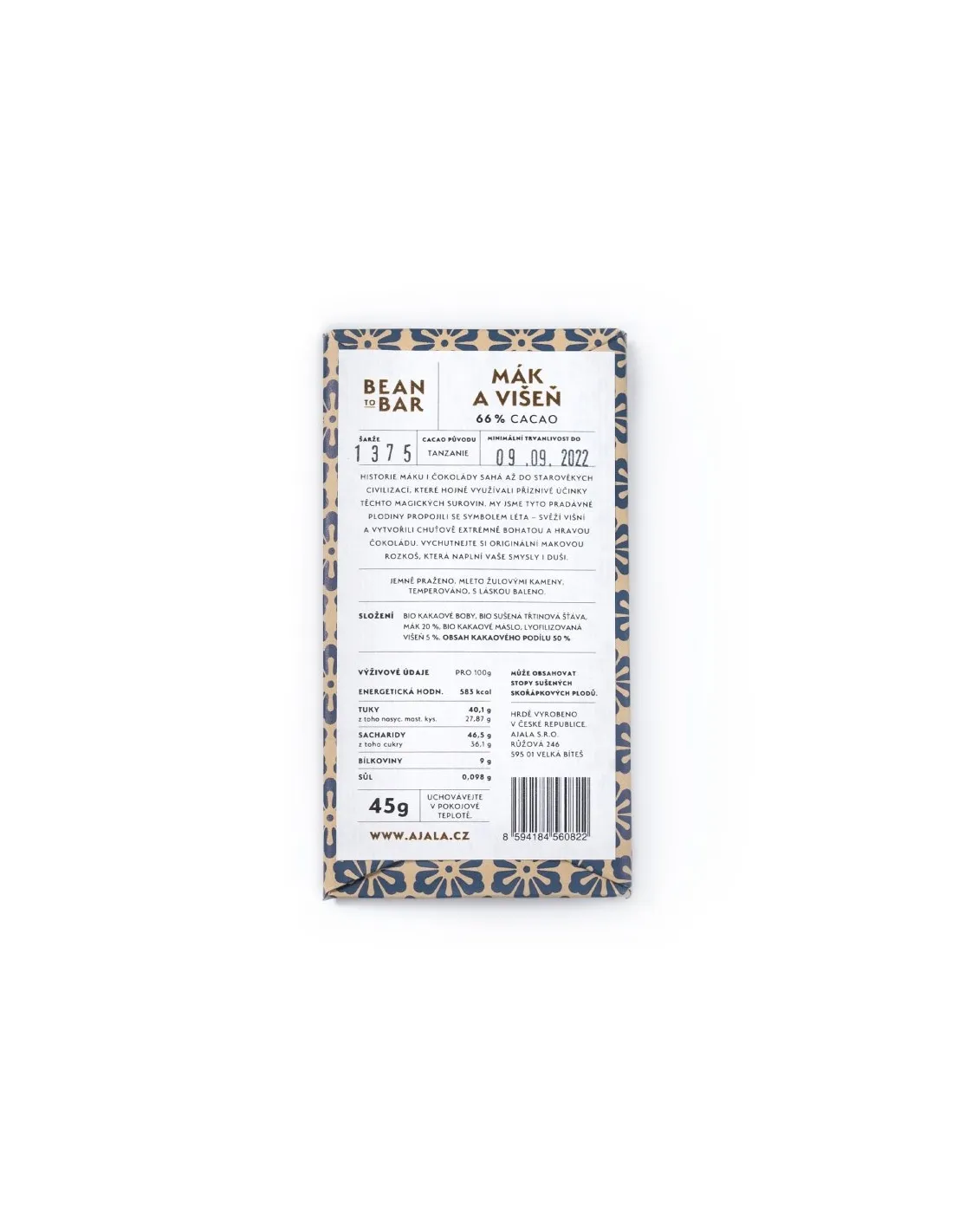 Zloženie: bio kakaové bôby, bio sušená trstinová šťava, mak, bio kakaové maslo, za studena lisovaný makový olej, mrazom sušené čerešne