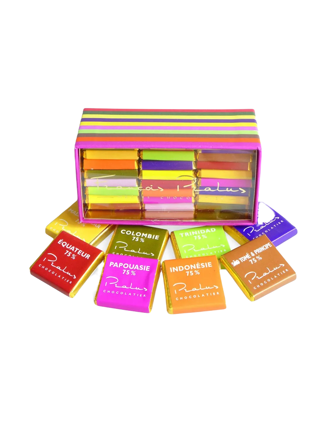 Ochutnávková sada jednooblastných 75% mini čokolád Francois Pralus z rôznych oblastí sveta.