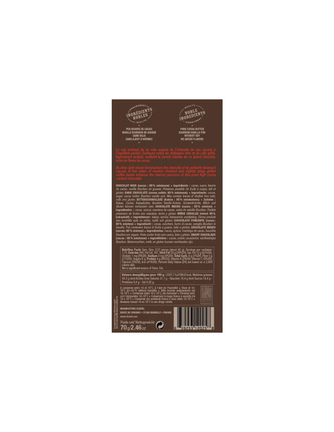 85% čokoláda vyrobená zo starostlivo vybranej kombinácie rôznych odrôd kakaa zo Strednej Ameriky, Afriky a Jávy. Intenzívna a zároveň jemná čokoláda s príjemne vyváženou chuťou.