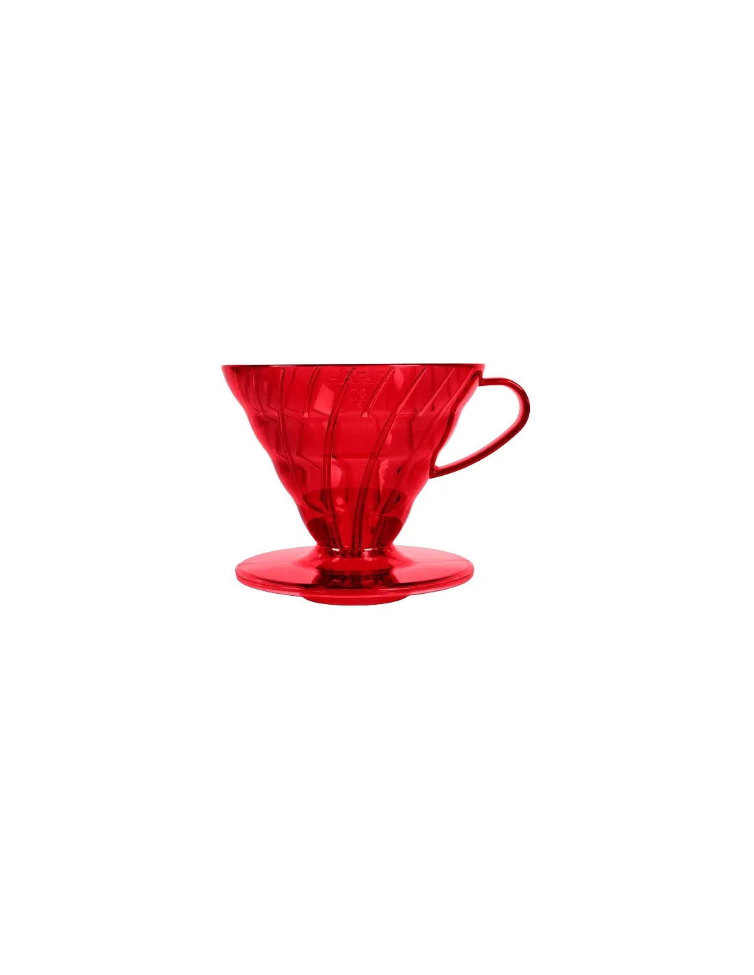 Plastový dripper Hario V60 na jednoduchú prípravu 1-4 šálok filtrovanej kávy. Červený dizajn.