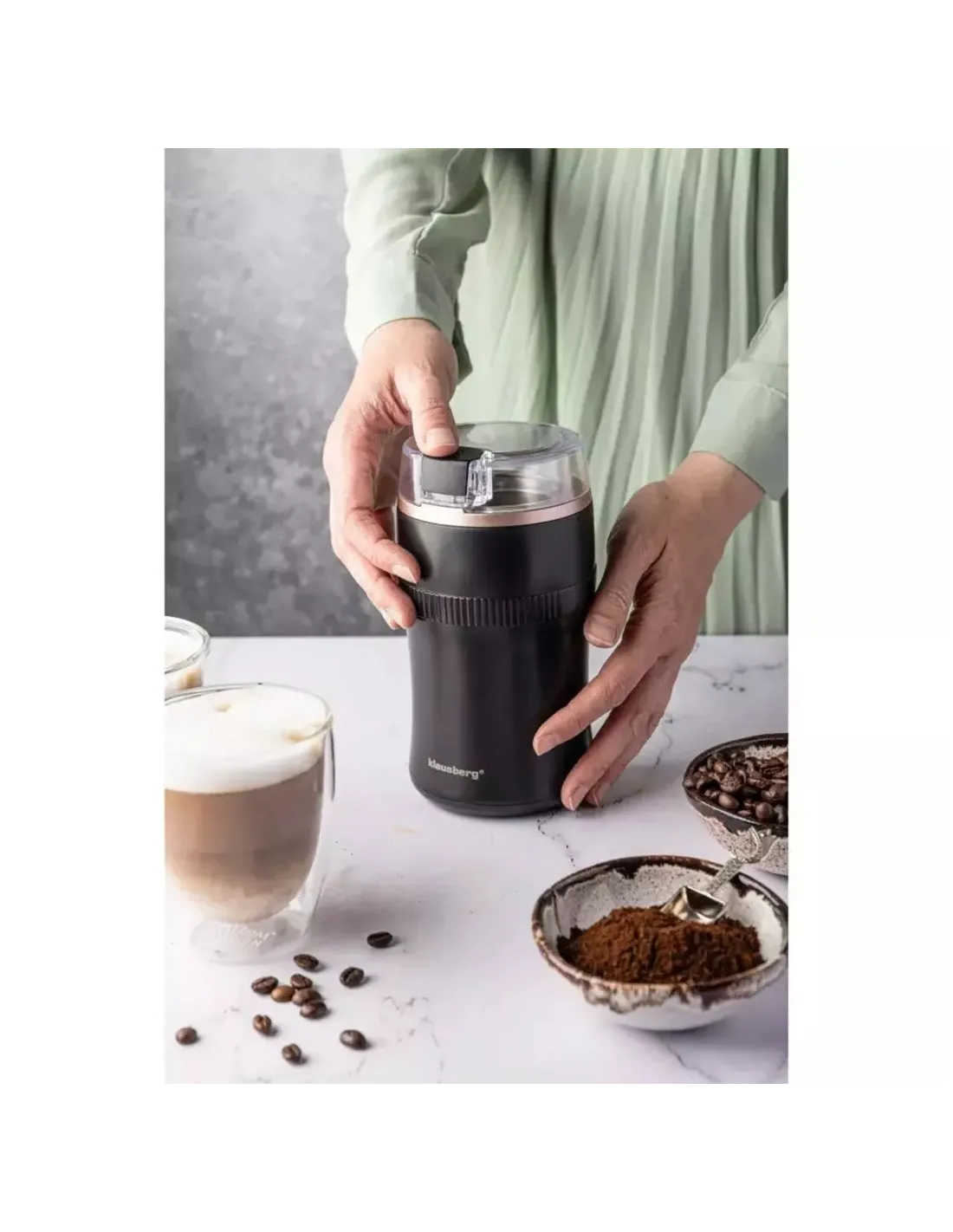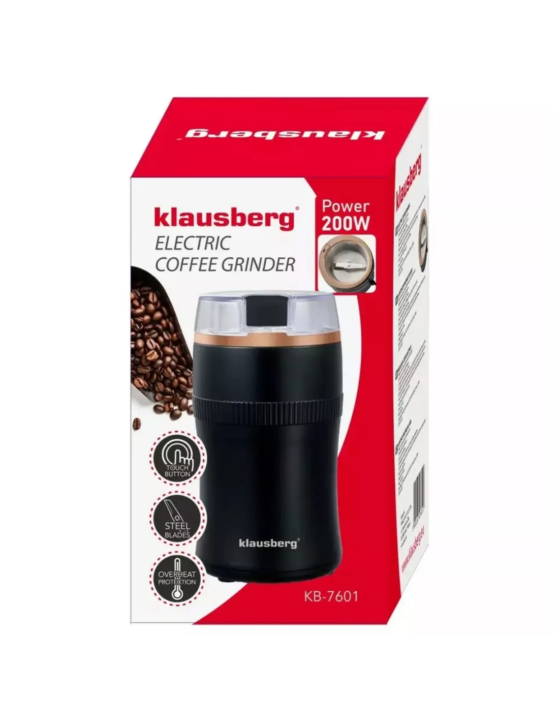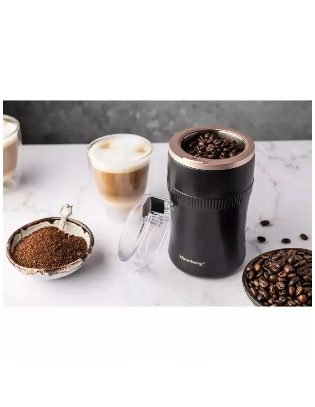 Elektrický mlynček na kávu Klausberg zabezpečuje rýchle a účinné mletie vďaka výkonnému 200W motoru. Okrem kávy dokáže mlieť aj orechy alebo korenie.