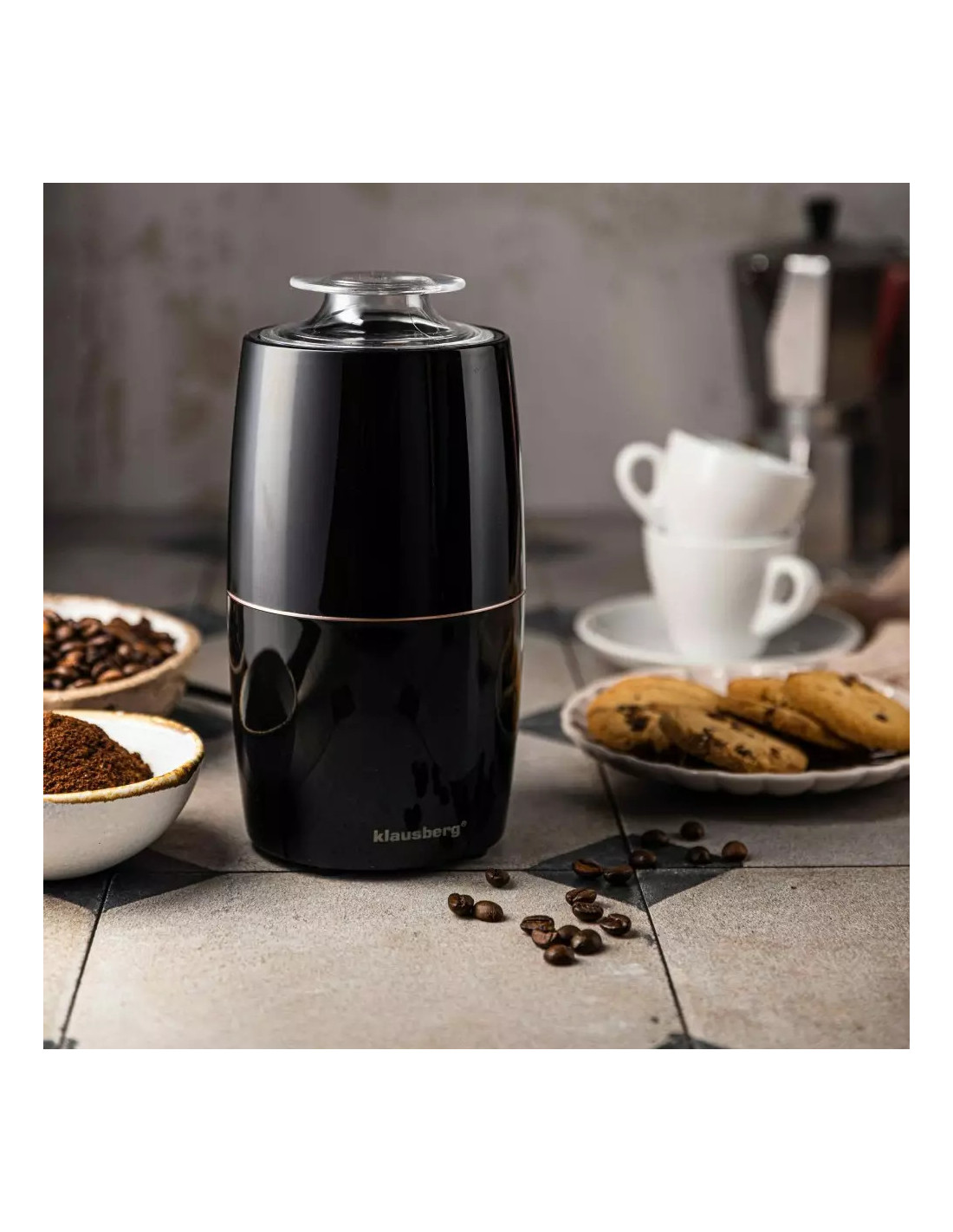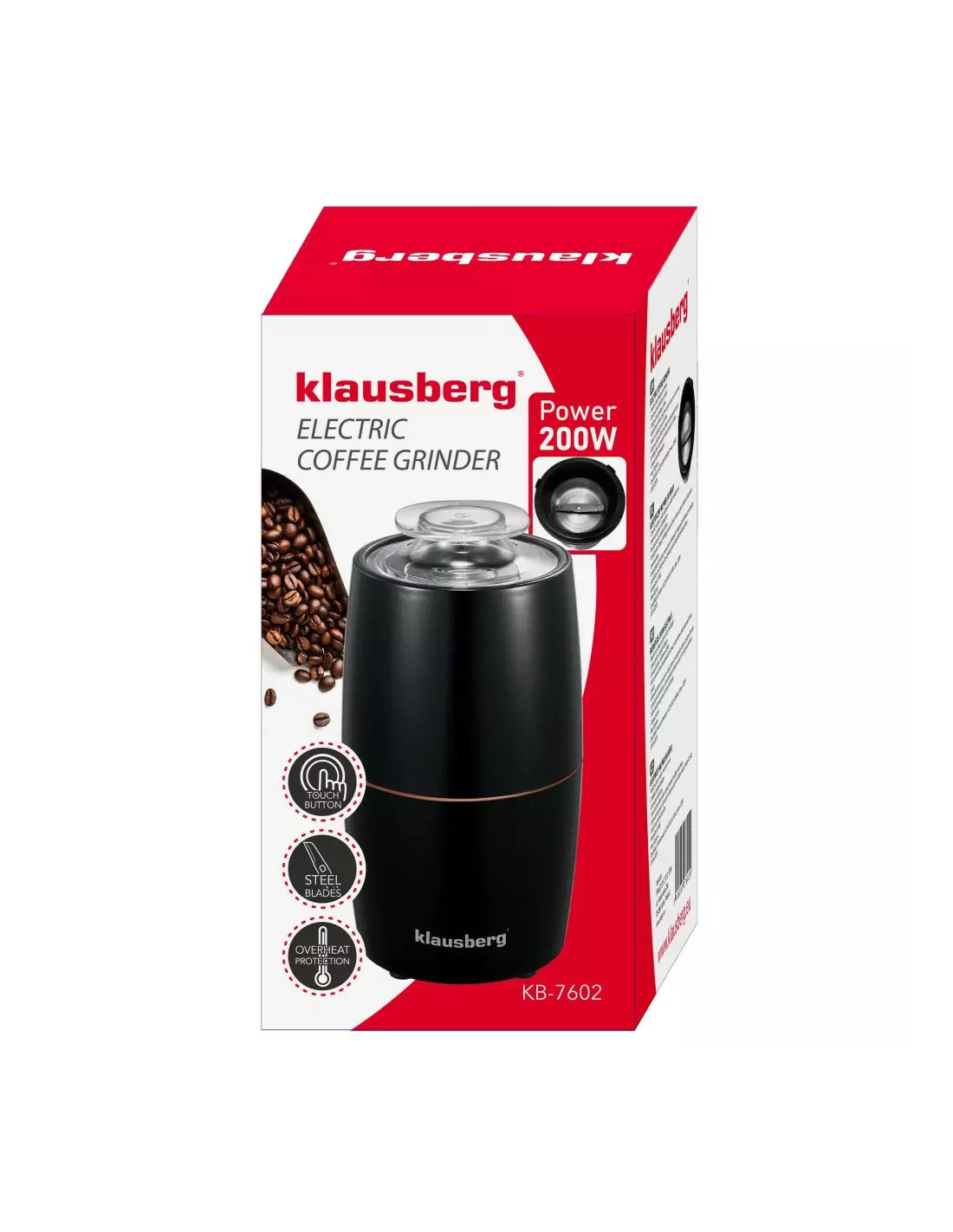 Kompaktný elektrický mlynček Klausberg s nožom a nádobou z nehrdzavejúcej ocele. Jednoduché ovládanie jedným tlačidlom, vhodný na jemné a hrubé mletie.
