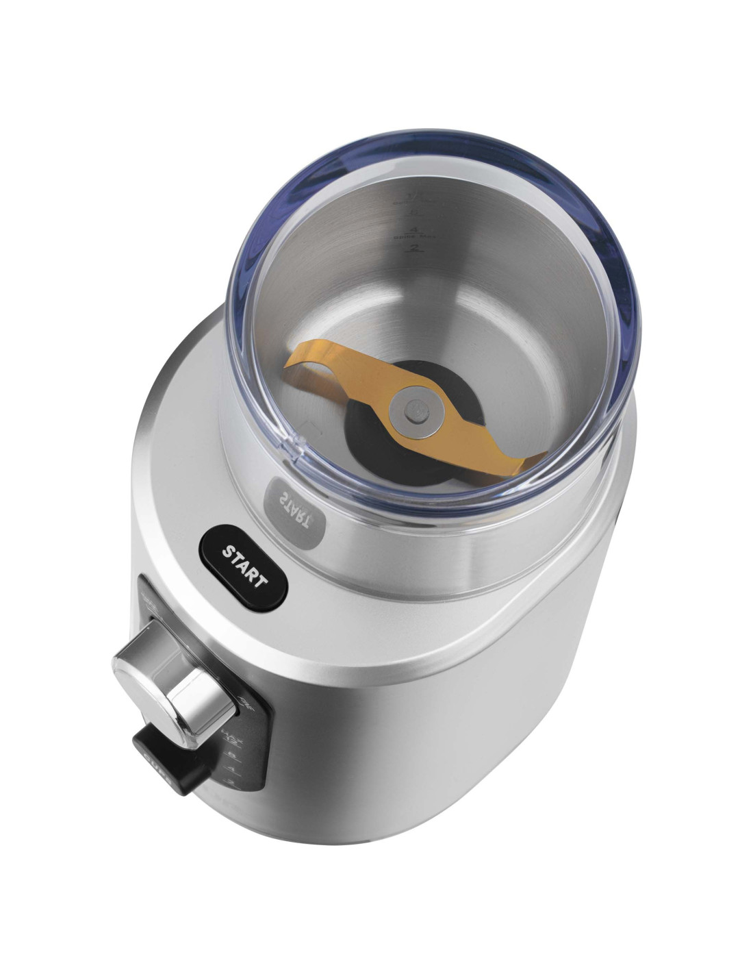 Mlynček pojme až 60 gramov kávových zŕn, čo zodpovedá približne 12 šálkam kávy. Zásobník z nehrdzavejúcej ocele a titánom potiahnuté čepele zaručujú dlhú životnosť a jednoduché čistenie. Elegantné pochrómované tlačidlo, kompaktný dizajn a možnosť ukryť napájací kábel v základni robia z tohto modelu štýlový a praktický doplnok každej kuchyne.