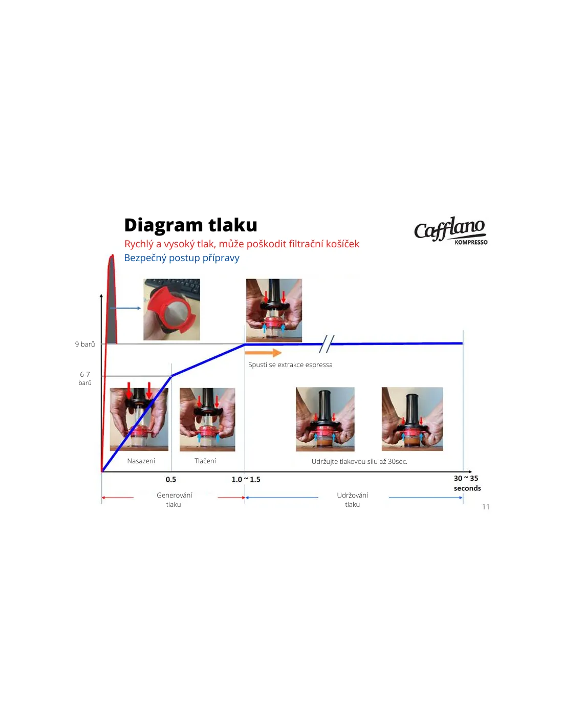 Ak niekoľko sekúnd netečie káva a cítite väčší odpor, musíte kávu namlieť trochu hrubšie! Tlak na piest vyvíjajte postupne, celý proces varenia by mal trvať približne 1 minútu (pozri diagram tlaku v návode vyššie pod obrázkom). Ak tieto odporúčania nedodržíte, môže dôjsť k poškodeniu filtra. Tlakový piest dotiahnite k zásobníku na kávu naozaj jemne, inak môžete poškodiť tesnenie kovového filtra. Na tieto závady spôsobené nesprávnym používaním sa záruka nevzťahuje!