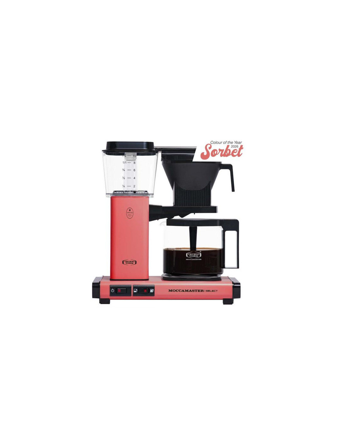 Domáci kávovar Technivorm Moccamaster KBG pripraví až 1,25 litra vybranej filtrovanej kávy. Verzia KBG Select umožňuje výber medzi 6 a 10 šálkami. Teraz je k dispozícii vo farbe roka 2026 - svieži odtieň Sorbet.