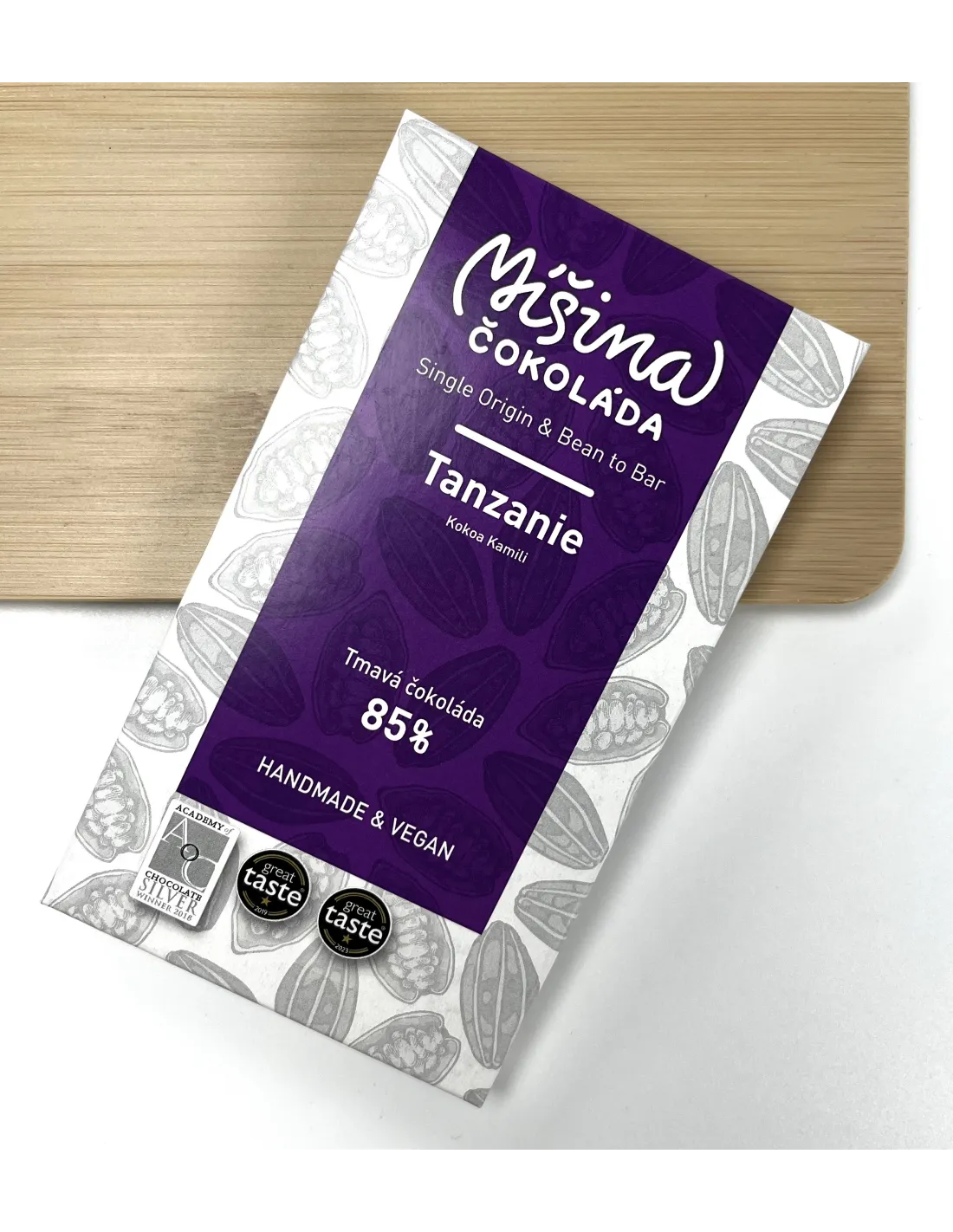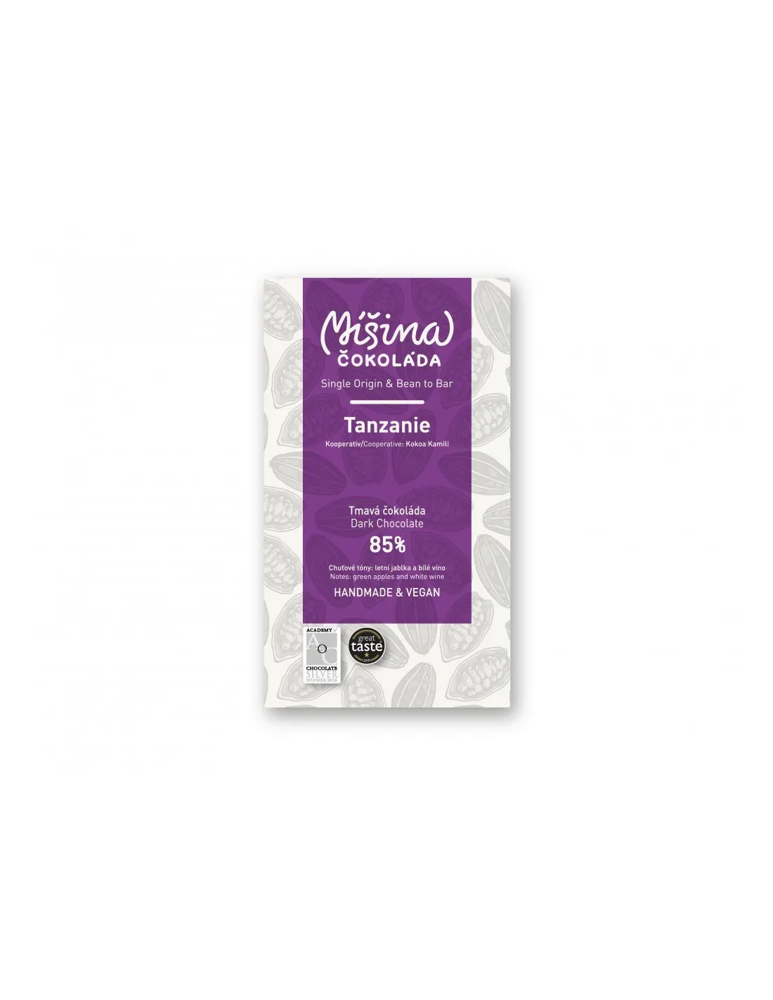 Horká čokoláda 85 % s vysokým obsahom vybraných organických kakaových bôbov z Tanzánie. Hladké až maslové s tónmi jabĺk a čerešní.