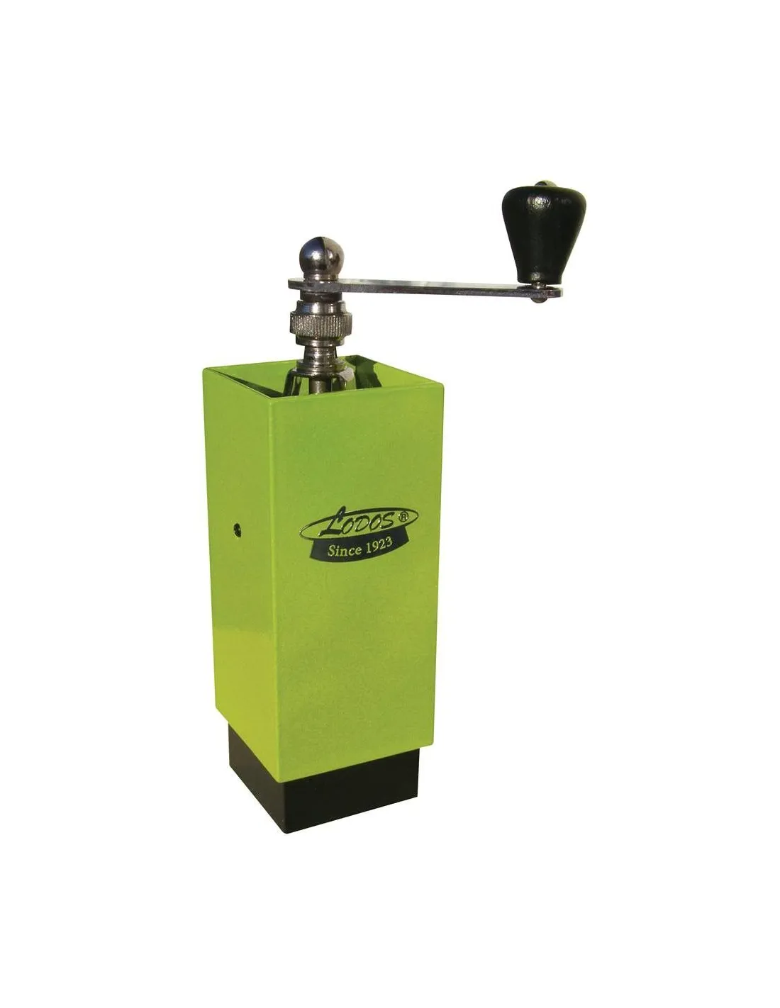 Krásny zelený ručný mlynček na kávu s mlecími kameňmi, ktorý je vďaka svojej menšej veľkosti vhodný aj na cesty. Zásuvka pojme až 30 g mletej kávy.