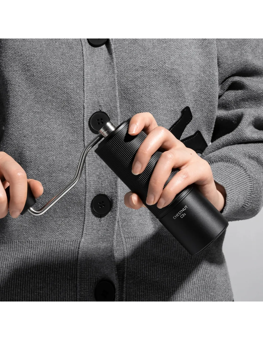 Textúrovaný povrch zaručuje, že vám mlynček nevypadne z ruky a mletie bude pohodlné. S priemerom len približne 52 mm a výškou a rukoväťou 147 mm splní mlynček Timemore očakávania všetkých cestovateľov. Šesťhranné zakončenie rukoväte zaručuje pohodlné brúsenie a jednoduché nasadenie rukoväte.