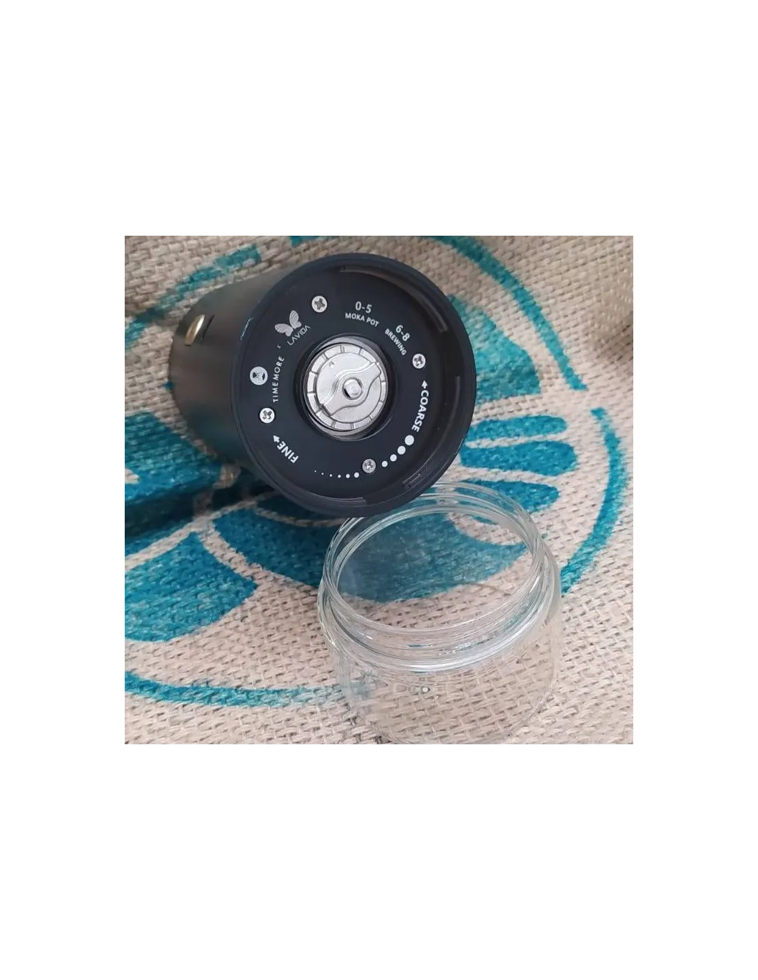 Vzhľad mlynčeka je minimalistický, matný čierny plast zdobí jediné stredové zlaté tlačidlo na spustenie mletia. Kontajner na mletú kávu je z priehľadného skla. Kontajner dokonale zapadá do tela mlynčeka, takže nemusíte nosiť vzduchotesnú dózu :) Na rozdiel od ľahkého plastového tela, mlynček má vysoko odolné oceľové mlecí kamene. Nechýba ani kovová osa mlynčeka s 2 ložiskami.