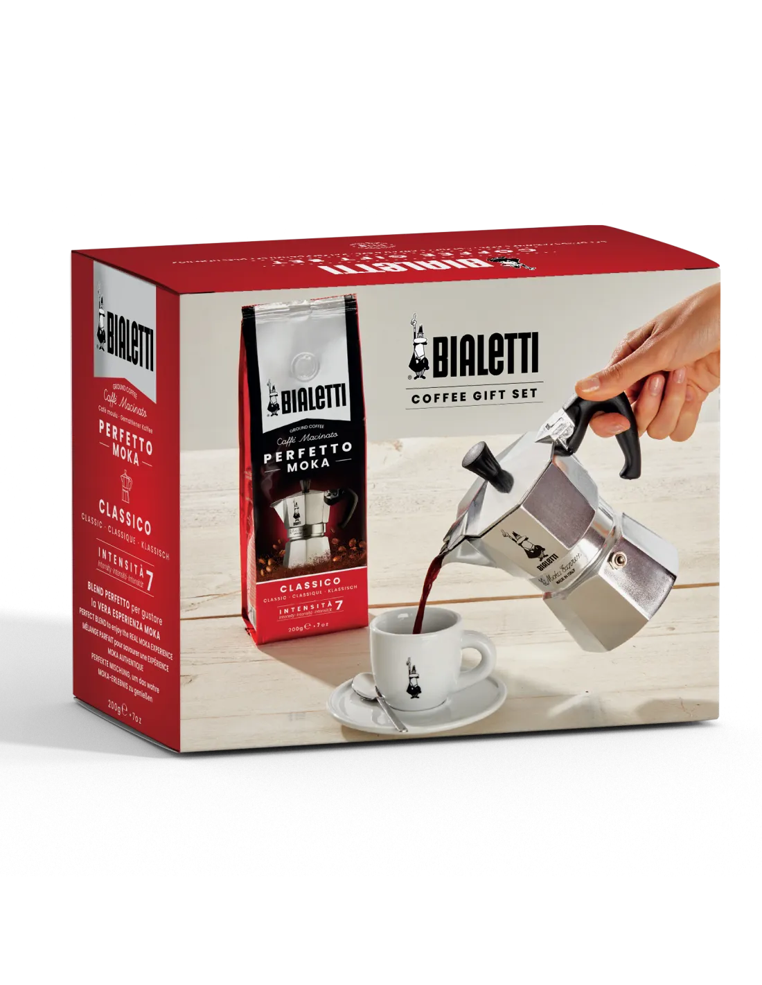 Legendárny moka kanvička Bialetti Moka Express od talianskej spoločnosti Bialetti na tradičnú prípravu silnejšej kávy. Vhodné pre 6 šálok, t. j. približne 270 ml. Darčekové balenie s 200 g kávy Bialettii.