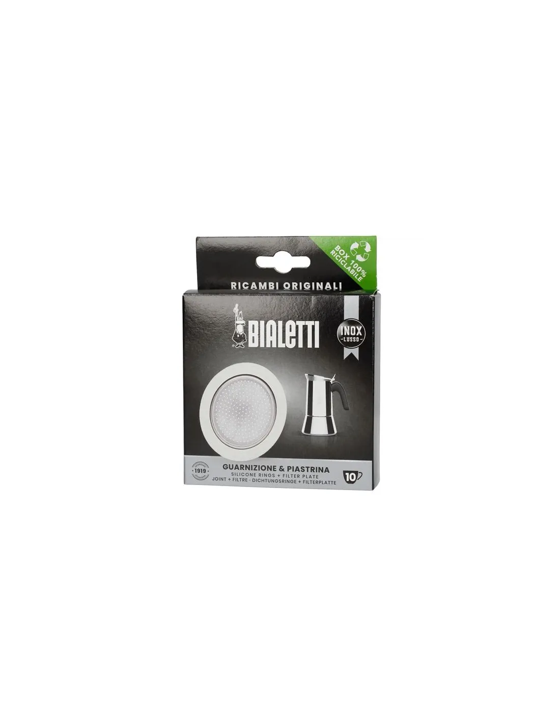 Balenie obsahuje 1x náhradné silikónové tesnenie pre nerezové moka kanvice Bialetti vo veľkosti 10 šálok a 1x náhradné sitko z nehrdzavejúcej ocele.