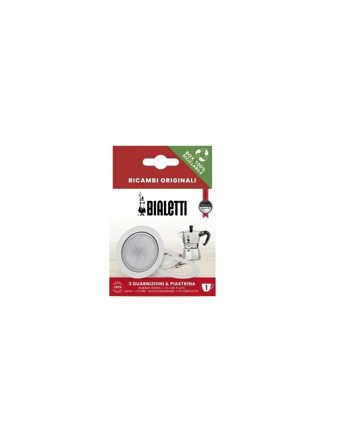 Balenie obsahuje 3x náhradné gumové tesnenia pre hliníkové moka konvice Bialetti vo veľkosti 1 šálky a 1x náhradné hliníkové sitko.