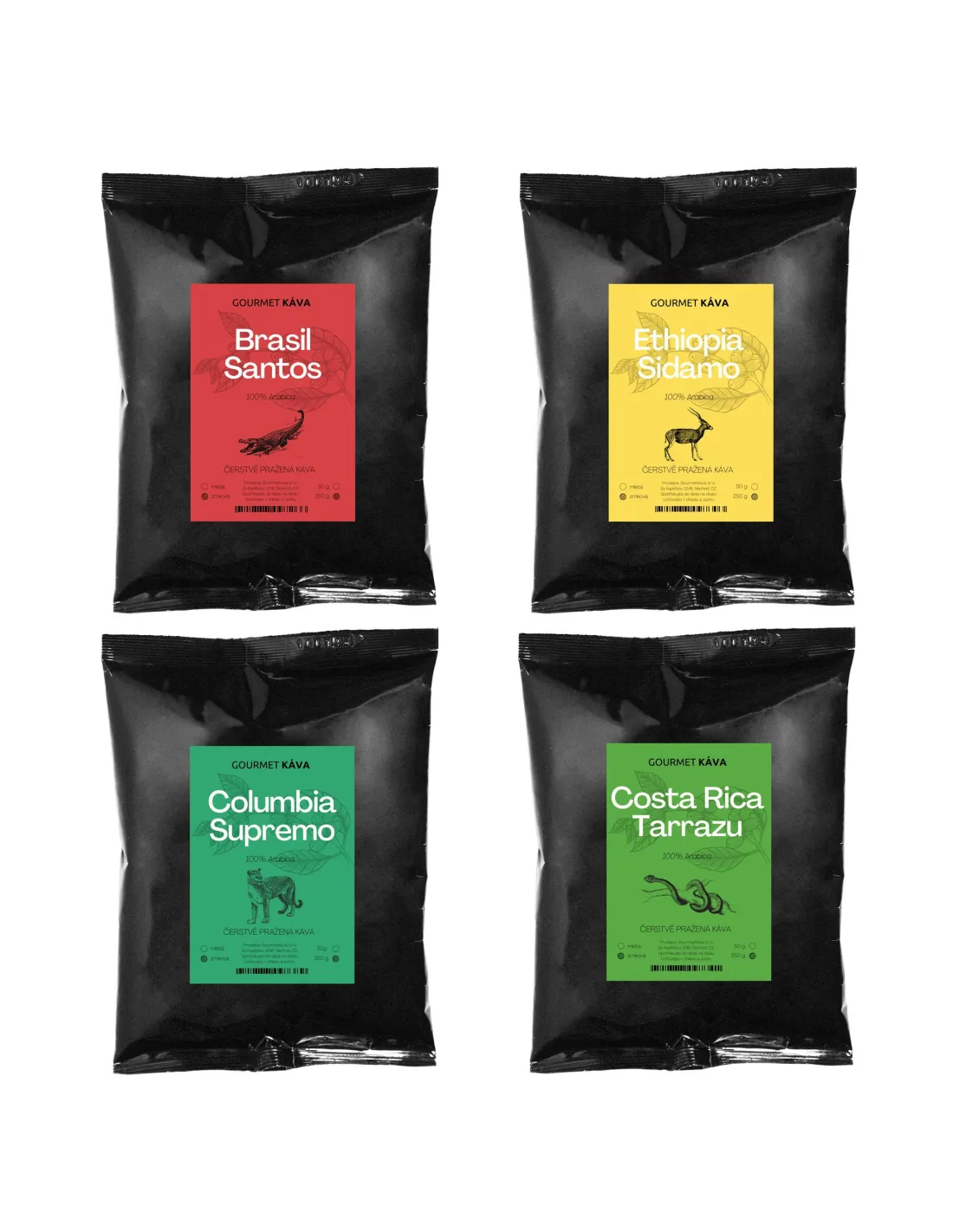 Tieto 4 kávy sú ideálnym prierezom našich káv a to od tej najjemnejšej Brazil Santos , cez perfektne vyváženú Kostariku Tarazzu a Kolumbiu Supremo , po príjemne ovocnú kávu Etiópiu Sidamo .