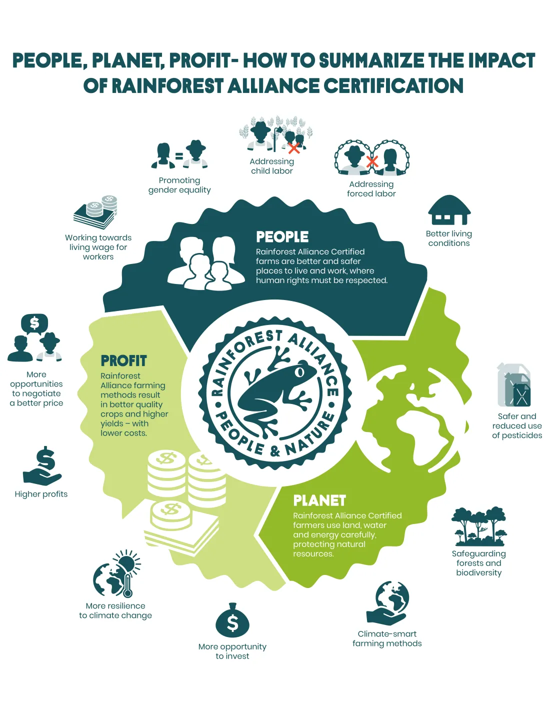 Životné prostredie: farmári musia obnoviť alebo udržať pôvodný lesný porast svojho územia tak, aby bolo aspoň 40 % plochy pokryté tieňom. Pestovatelia musia zachovávať prirodzené vodné toky . Zakázané je akékoľvek obchodovanie s divokými zvieratami, ničenie ich prirodzeného prostredia, ničenie ekosystémov, či znečisťovanie prírody. Snaží sa o trvalé prirodzené spolužitie divokých zvierat, rastlín a ľudí.