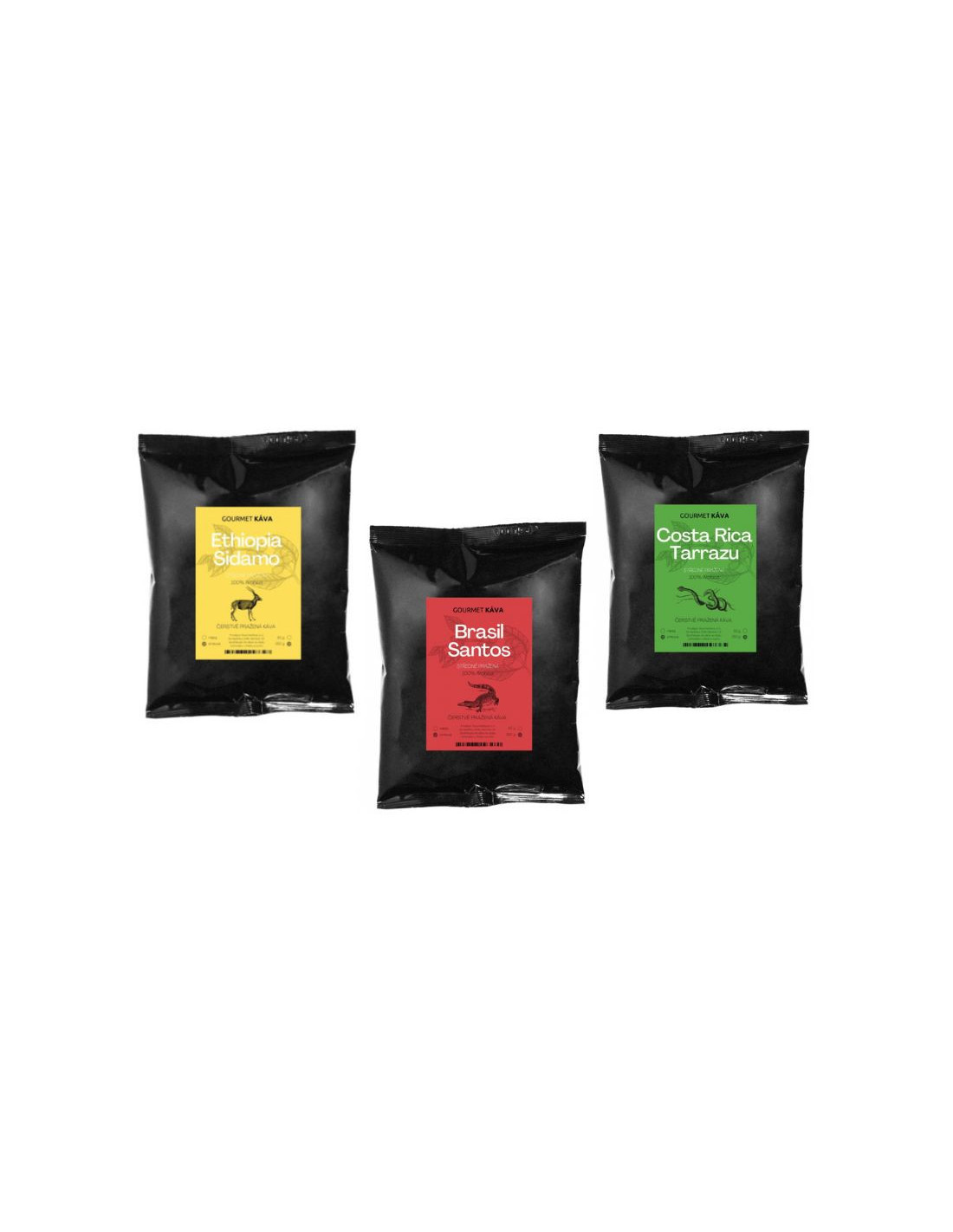 - 1x 250g Brazília Santos stredne pražená, 1x 250g Etiópia Sidamo stredne pražená a 1x 250g Kostarika Tarazzu stredne pražená