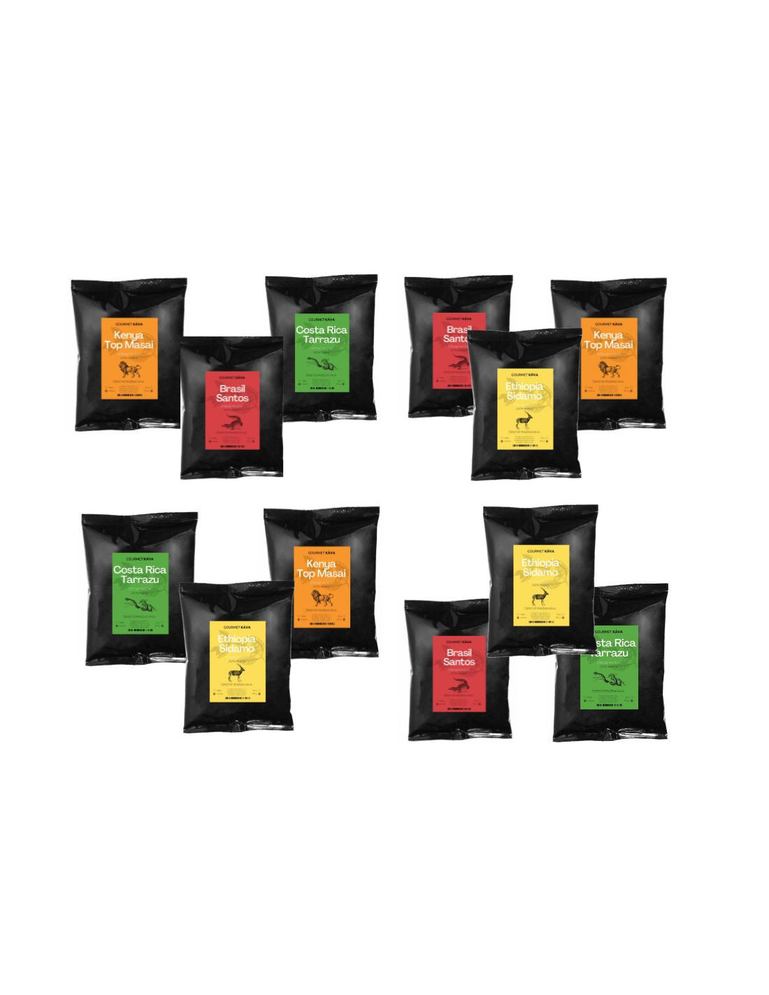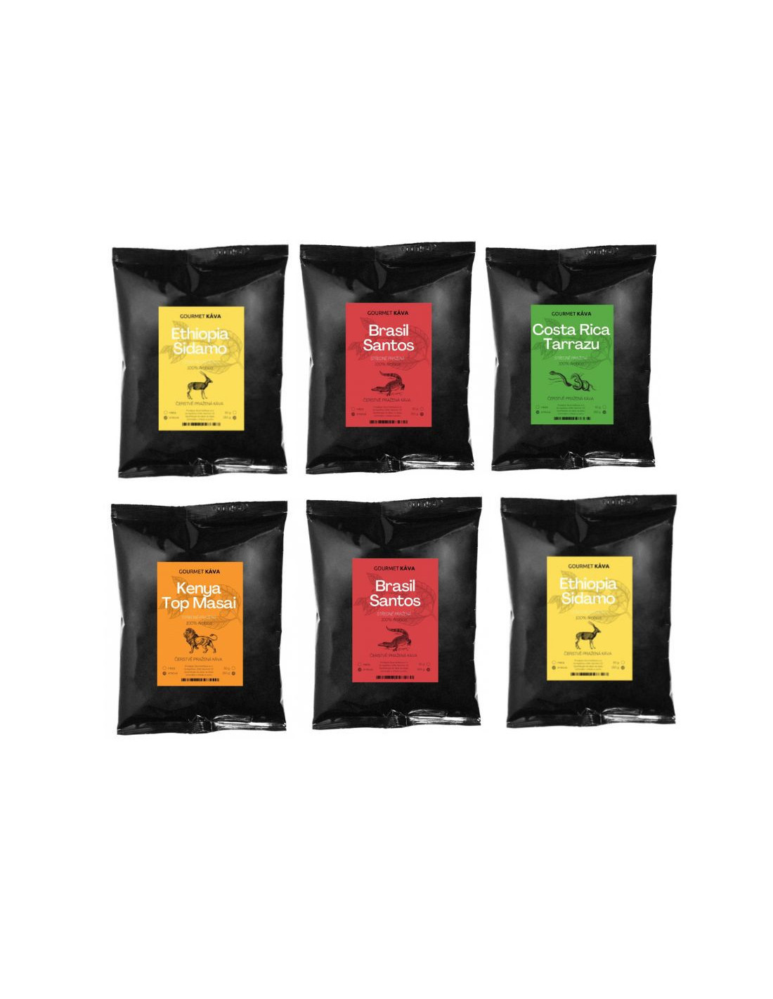 - 3x 250g Brazília Santos stredne pražená, 3x 250g Etiópia Sidamo stredne pražená, 3x 250g Kostarika Tarazzu stredne pražená a 3x 250g Keňa Top Masai stredne pražená