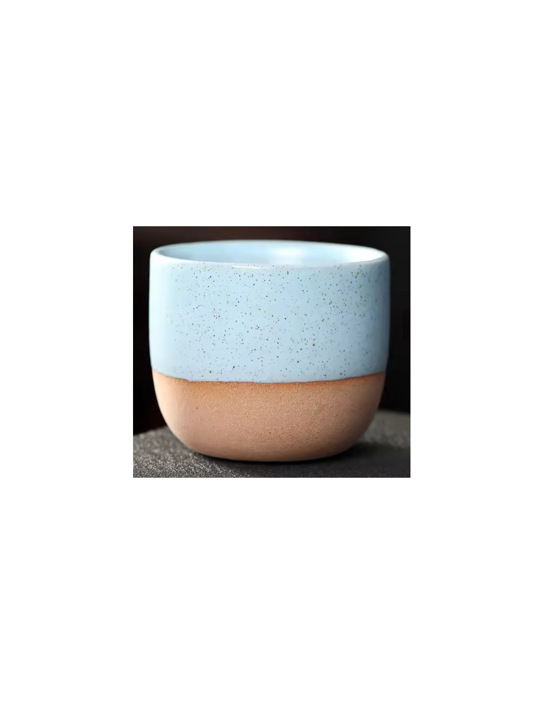 Tento kompaktný keramický pohár v sebe spája čistý tvar, pohodlné držanie a nadčasový vzhľad. Vrchná časť je glazúrovaná s jemným posypovým efektom, zatiaľ čo spodný pruh ponecháva prirodzenejšiu, matnú štruktúru. Vďaka hrubším stenám dobre drží teplotu a šálka vyzerá robustne, ale stále elegantne.