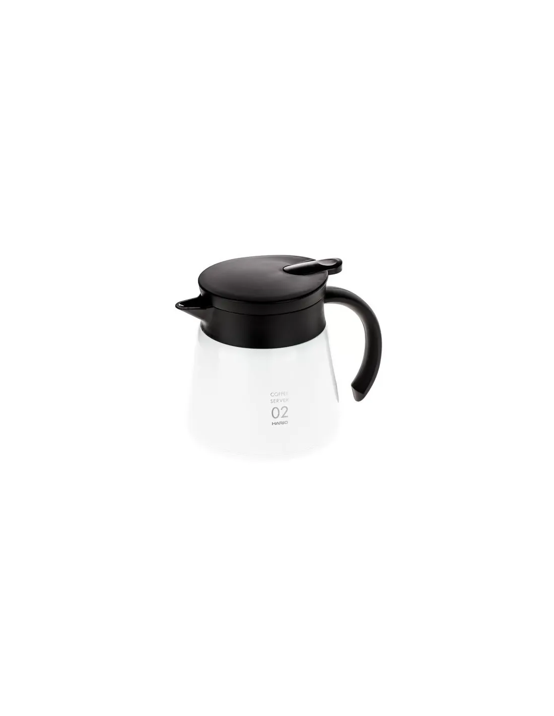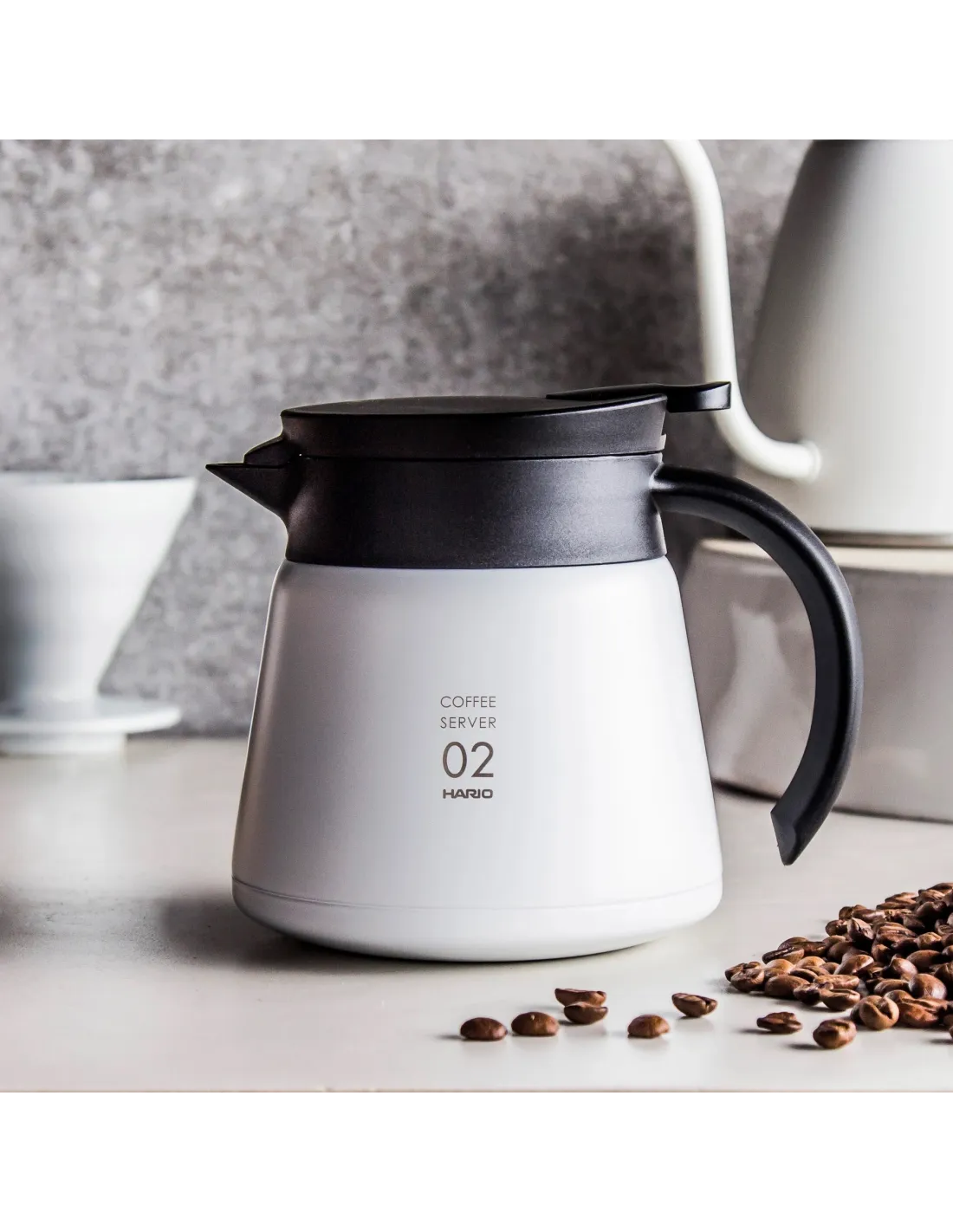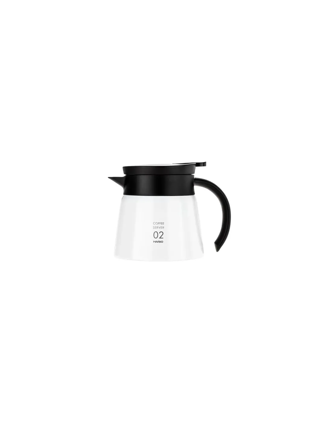 Dvojstenný vákuovo uzavretý nerezovýserver Hario V60 Thermo na profesionálne servírovanie čerstvej a horúcej kávy alebo iných nápojov. Objem: 600 ml.