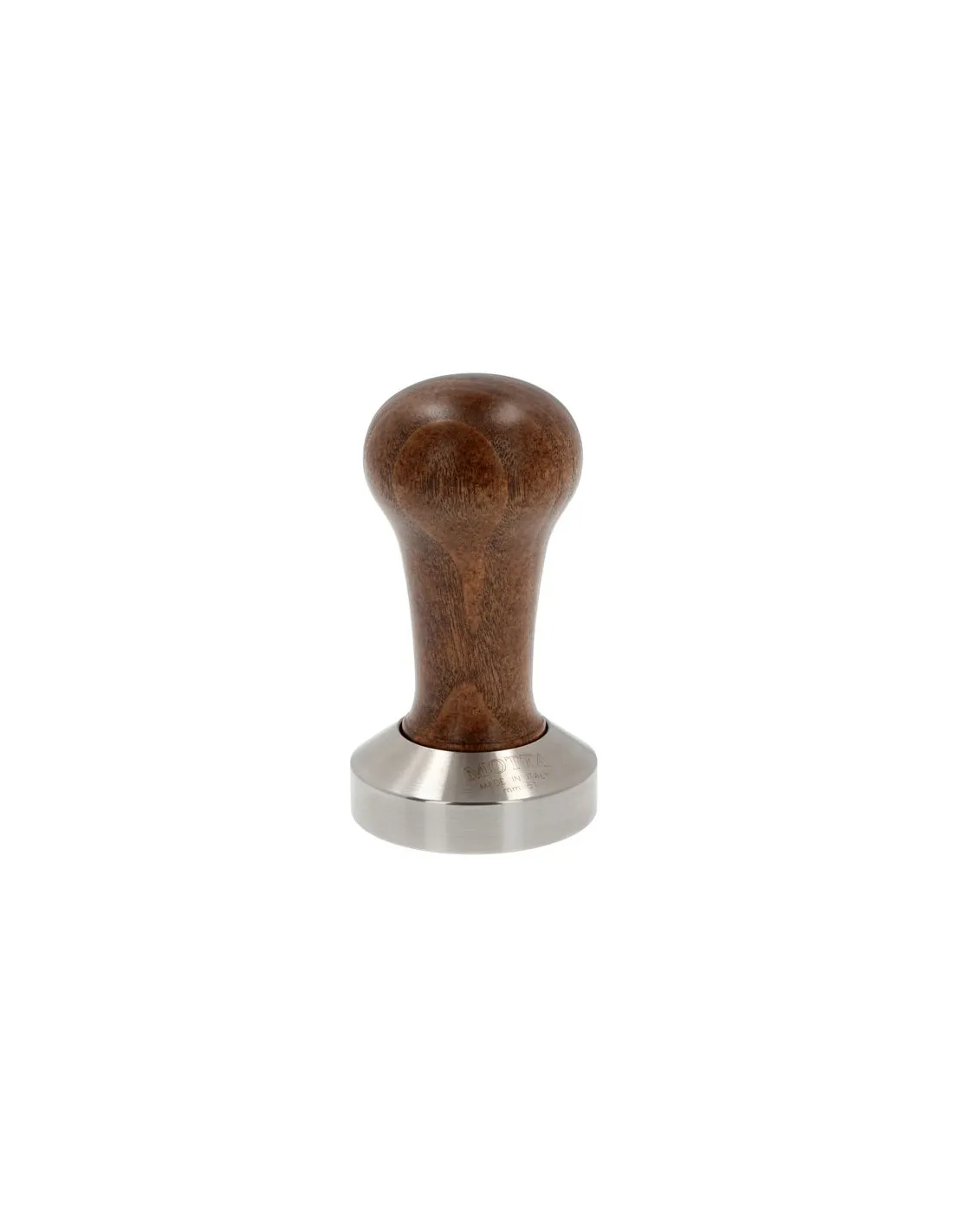Profesionálny tamper Motta má kovovú základňu a ergonomickú drevenú rukoväť a váži 350 g.