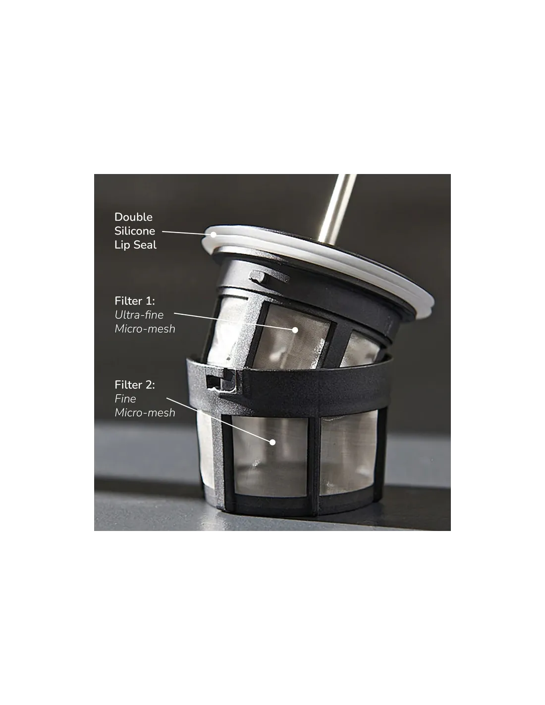 Druhou inováciou je spôsob stlačenia samotného filtra, ktorý po úplnom stlačení piestu až na dno zabraňuje pokračovaniu extrakcie, t. j. prenikaniu vylúhovanej kávy späť do nápoja. Vyrovnávací priestor medzi dvoma filtrami bezpečne oddeľuje extrahovanú kávu.